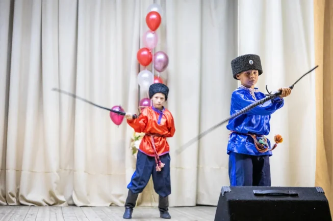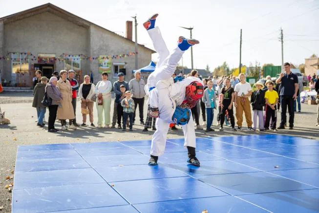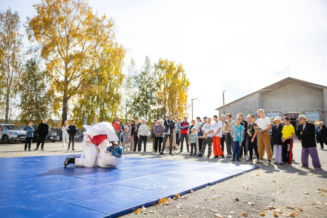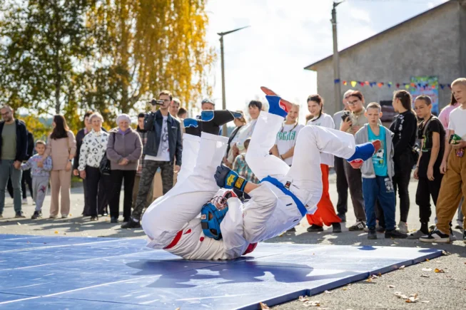 В это же время напротив Дома культуры бойцовский клуб «Универсальные бойцы» раскинул огромные синие маты, чтобы выступить перед гостями. Правда, показательное выступление клуба оказалось ну уж слишком коротким, не дольше пяти минут.