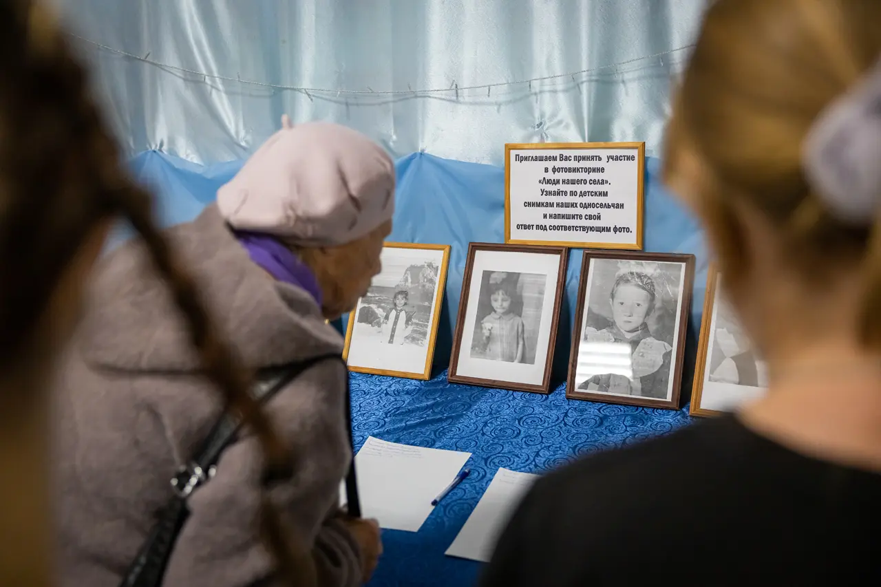Напротив стола с огурцами расположили зону с фото-викториной. Здесь шесть черно-белых фотографий с совсем молоденькими сельчанами поставили в рамки и предложили угадать, кто есть кто на этих карточках. Свой вариант ответа нужно было написать на листочках, которые лежали рядом. Судя по ответам, без проблем удалось отгадать Склюевых Максима, Ольгу и Варвару, Лапшанову Светлану, Сибирцеву Нэлли, а вот одно фото вводило мариинцев в раздумья, под ним написали всего один вариант — Алещенко Люда.