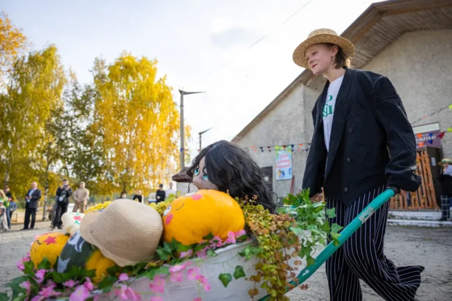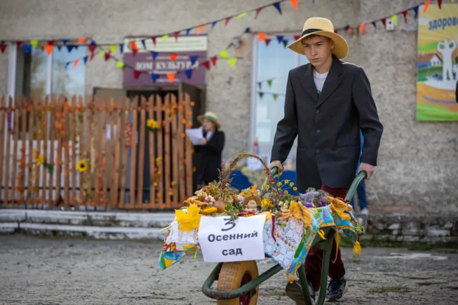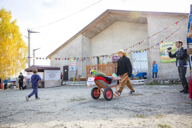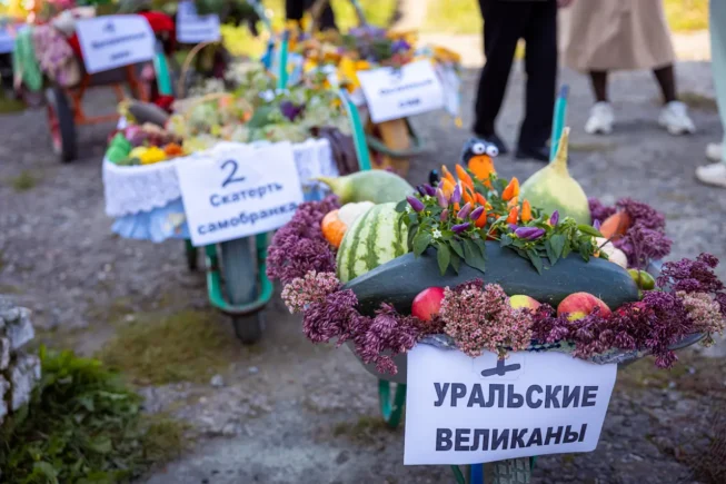 К этому времени народ стал подтягиваться на площадь, и стало заметно веселее. Все находились в ожидании главного события праздника — «Мичуринского заезда». И вот ровно по расписанию, в половине второго, юные воспитанники местного ДК в соломенных шляпах, черных пиджаках и белых футболках с надписью «Ревда» вышли к зрителям с зажигательным танцем, а затем провели дефиле огородных тачек, наполненных садовыми урожайными прелестями: огромными кабачками, спелыми яблоками, ярко-оранжевыми тыквами, морковками, цветами, кочанами капусты, а в одной тачке даже расположилась курица с яичками (вот только курочка была игрушечная, а яички зато — самые настоящие!).