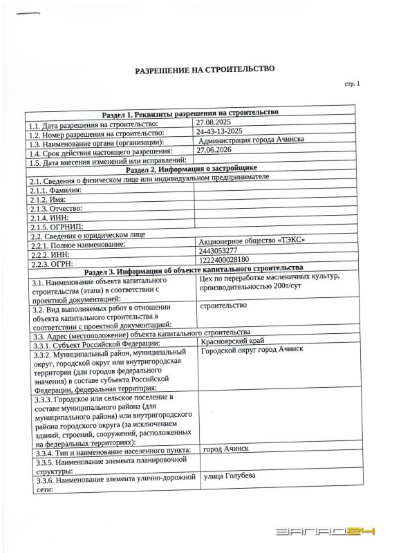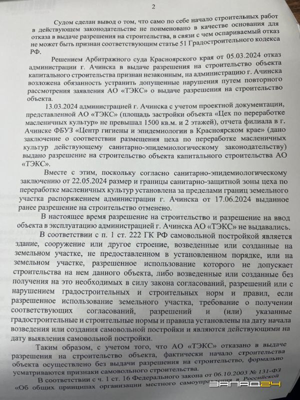 27 августа администрация Ачинска без публичных заявлений выдала АО «ТЭКС» разрешение на строительство цеха по переработке масличных культур производительностью 200 тонн в сутки. В народе это здание известно как «нелегальный рапсовый завод». Ранее его уже запускали в работу, зловониями предприятие отравляло жизнь людей, работающих по соседству, пишут местные СМИ.