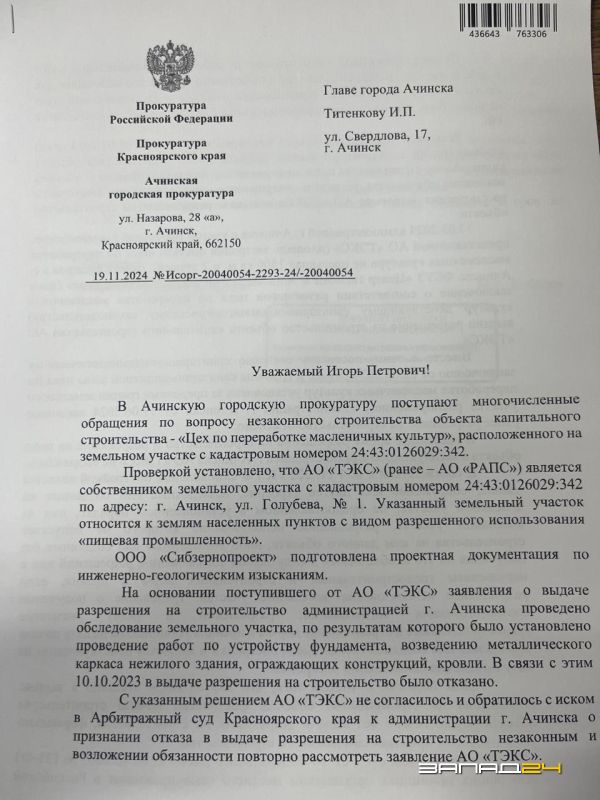 Издание отмечает: в ноябре 2024 года городской прокурор требовал снести завод после проверки и обнаружения объекта самовольного строительства. Позиция надзорного ведомства изменилась, когда краевой прокурор Роман Тютюник ждал переназначения, пишет «Запад 24». Ранее Тютюник держал скандальную ситуацию на личном контроле, но новый ачинский прокурор Дмитрий Примоленный изменил заявленную позицию ведомства.