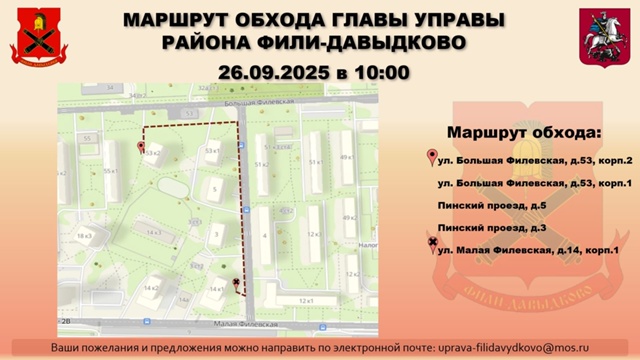 В ближайшую пятницу, 26 сентября, запланировано проведение совместного осмотра территории района Фили-Давыдково. Встреча представителей администрации с местными жителями намечена на 10:00.
