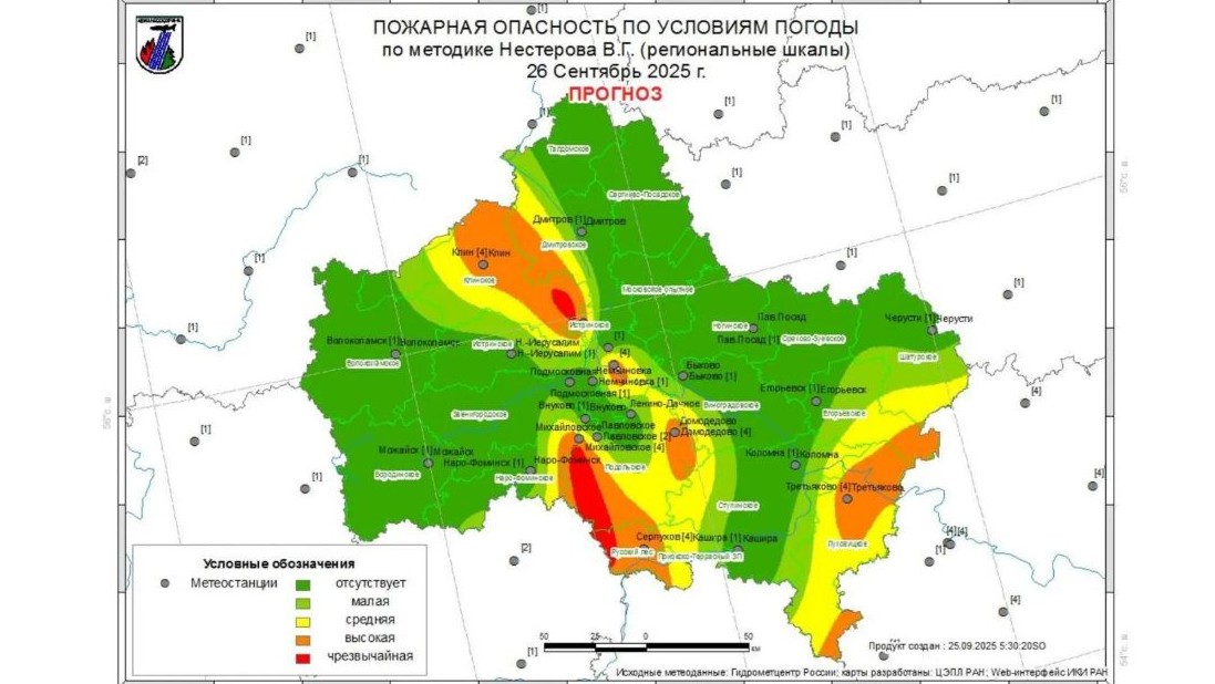ДВадцать шестого сентября на большей части территории Московской области ожидается I класс пожарной опасности, в Клинском, Луховицком, Подольском лесничествах, а также в лесничестве «Русский лес — IV класс пожарной опасности.