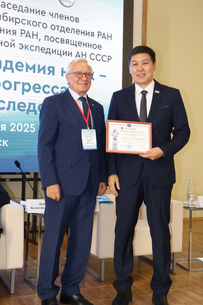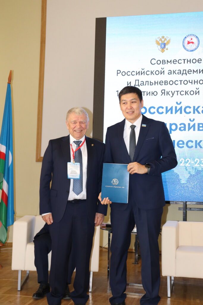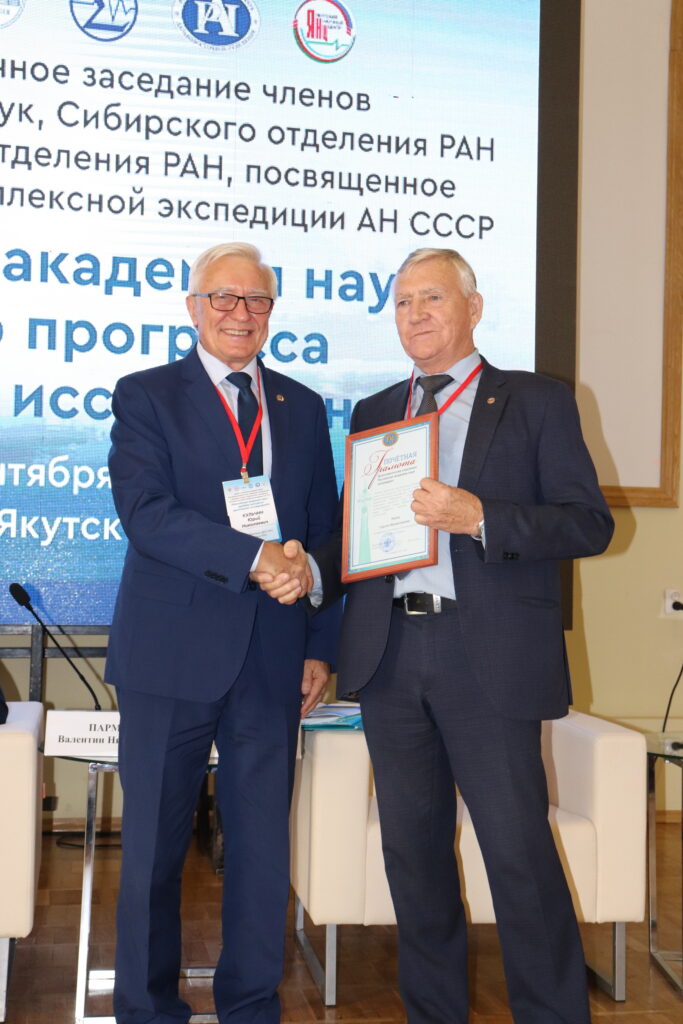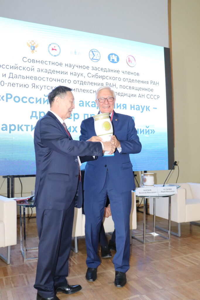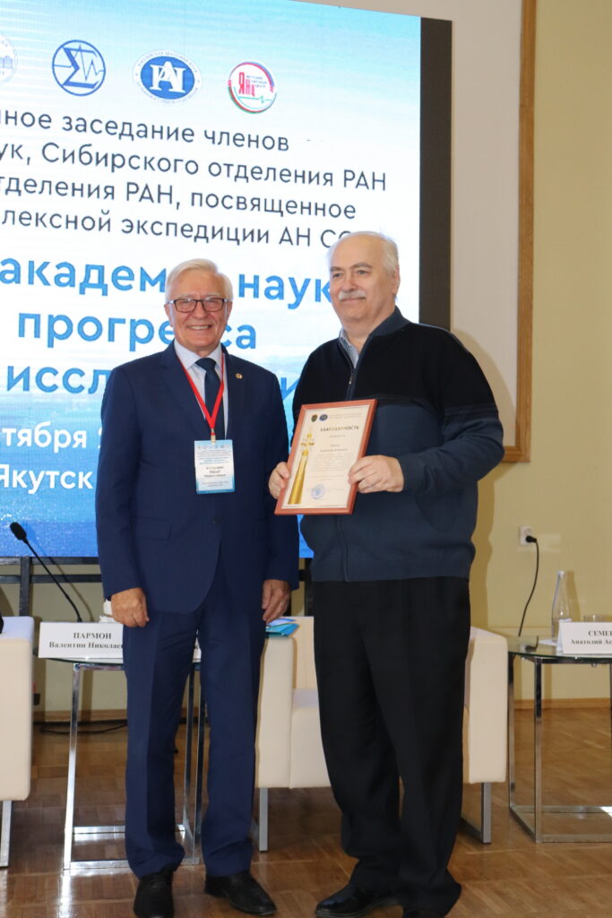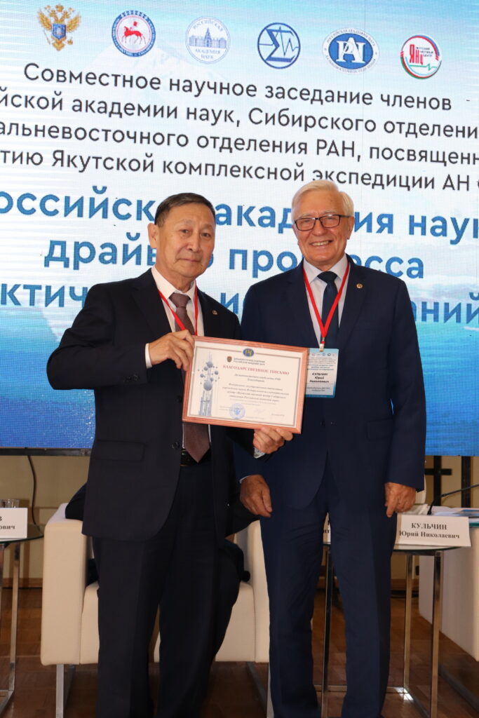 Валентин Николаевич передал Благодарственное письмо Главе Республики Саха (Якутия) Айсену Николаеву за оказанную помощь в организации совместного научного заседания.