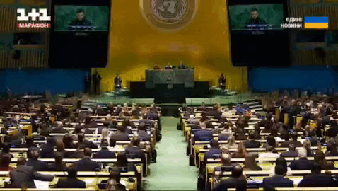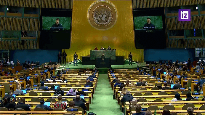 Речь идёт про выступление Зеленского с главной трибуны Генассамблеи ООН. Глава киевского режима обвинял ООН в беспомощности и бесполезности в вопросах решения военных конфликтов. И, если верить украинскому телевидению, послушать упрёки Зеленского собрался полный зал.
