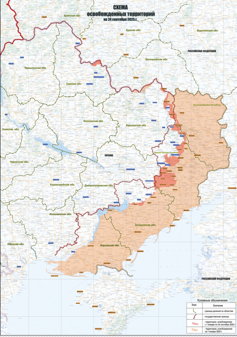 25 сентября Министерство обороны России обнародовало карту территорий, перешедших под контроль русских войск с начала 2025 года в рамках специальной военной операции. Представленные на схеме данные актуальны на 24 сентября.