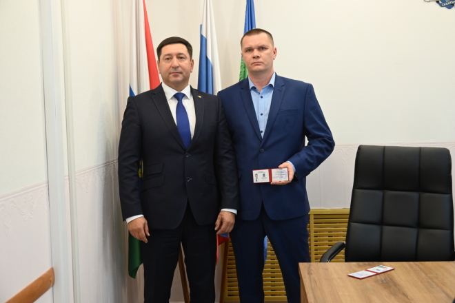 Глава района Олег Кузнецов вручает удостоверение депутата ветерану боевых действий Нурлану Яшкину