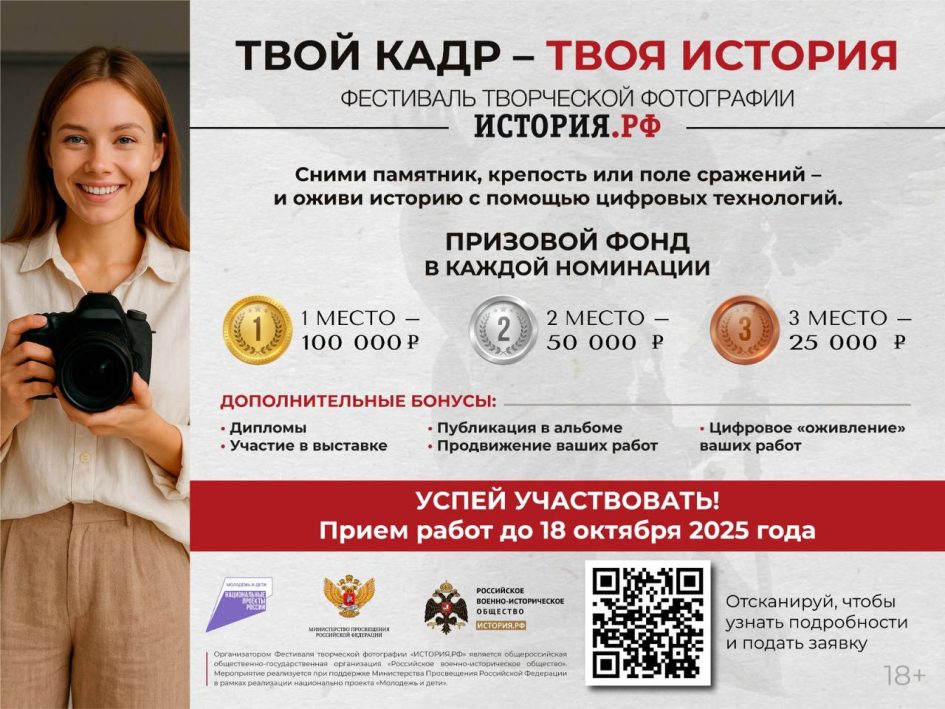 Продолжается прием работ на Фестиваль творческой фотографии «ИСТОРИЯ.РФ». Предоставить свои фотографии на конкурс можно до 18 октября 2025 года.