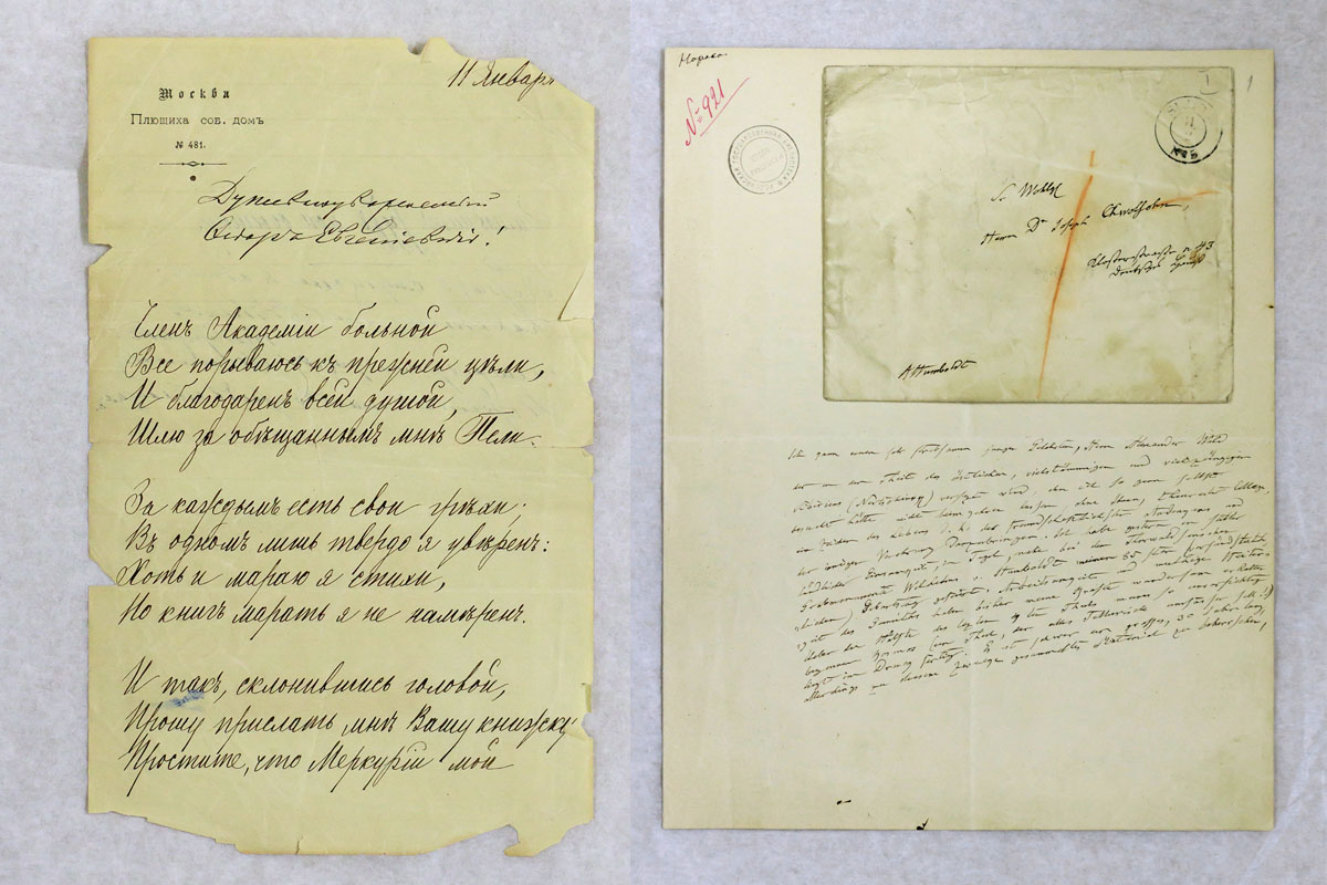Фото: Мария Говтвань, РГБ Слева: письмо Афанасия Афанасьевича Фета к Фёдору Евгеньевичу Коршу в стихах («Член Академии больной...»). 11 января 1887 года. Автограф и рукой секретаря