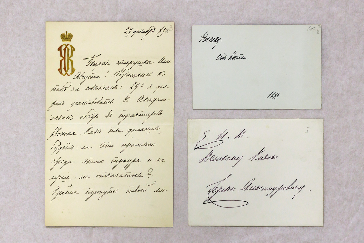 Фото: Мария Говтвань, РГБ Письмо великого князя Константина Константиновича Романова 27 декабря 1889 года и приглашение на ёлку, адресованные великому князю Сергею Александровичу Романову