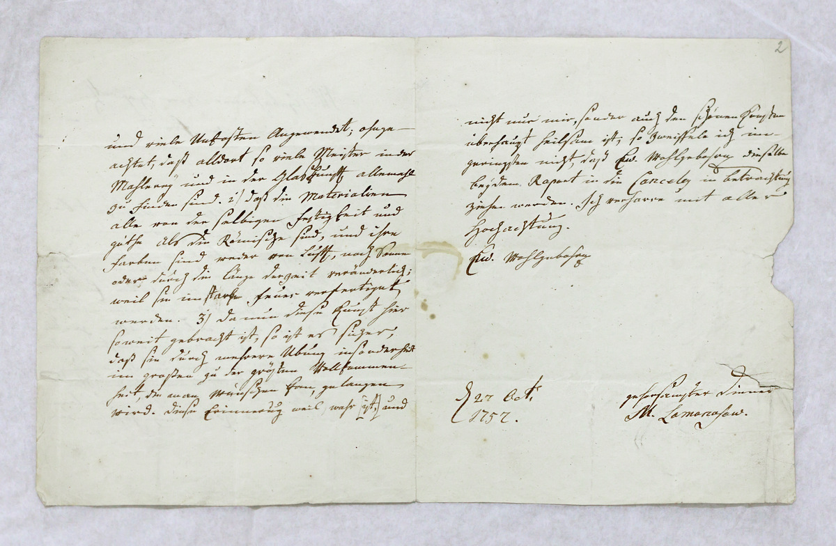 Фото: Мария Говтвань, РГБ Письмо Михаила Васильевича Ломоносова к академику Якову Яковлевичу Штелину. 27 октября 1757 года. На немецком языке