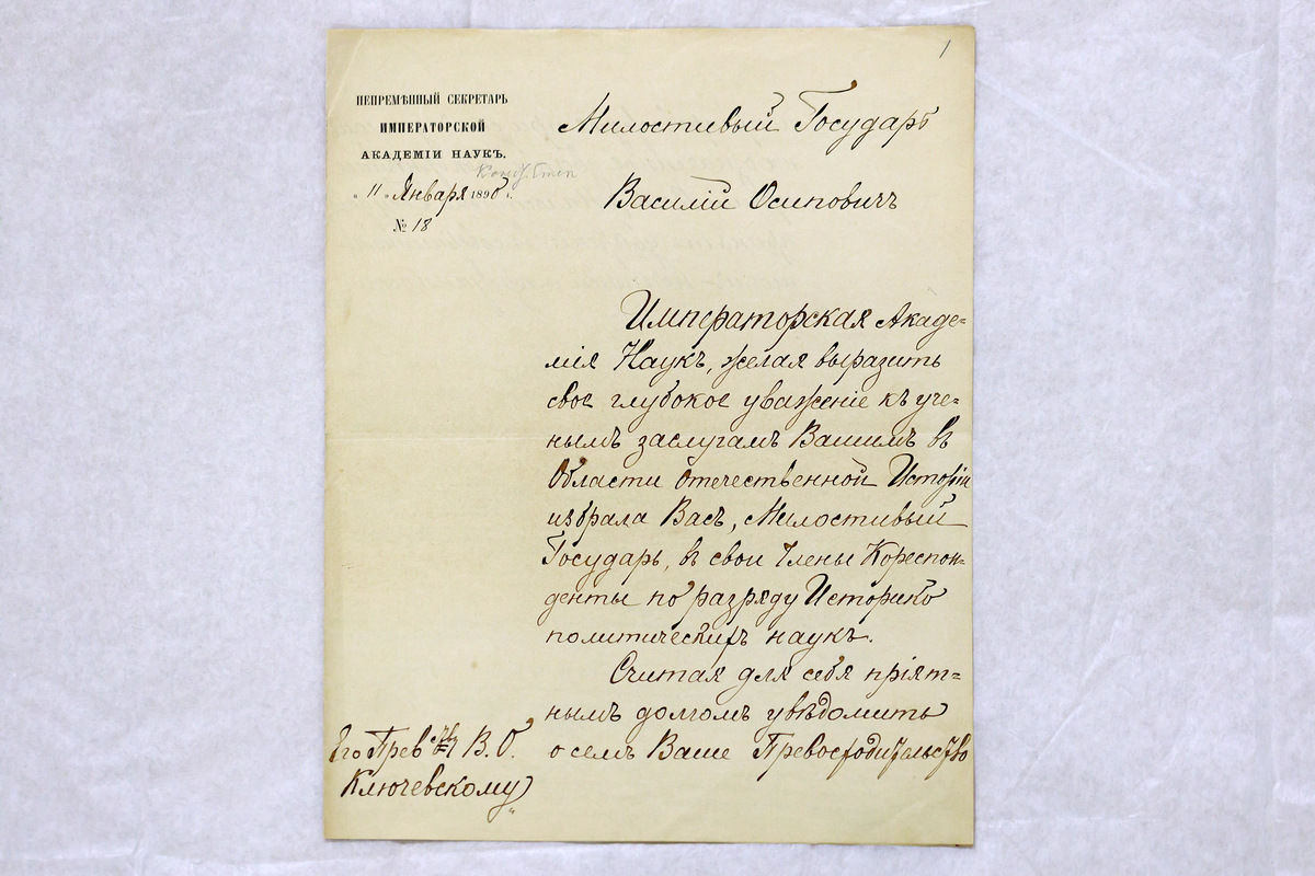 Фото: Мария Говтвань, РГБ Письмо-отношение Императорской академии наук к Василию Осиповичу Ключевскому с сообщением об избрании егов члены-корреспонденты Академии. 11 января 1890 года