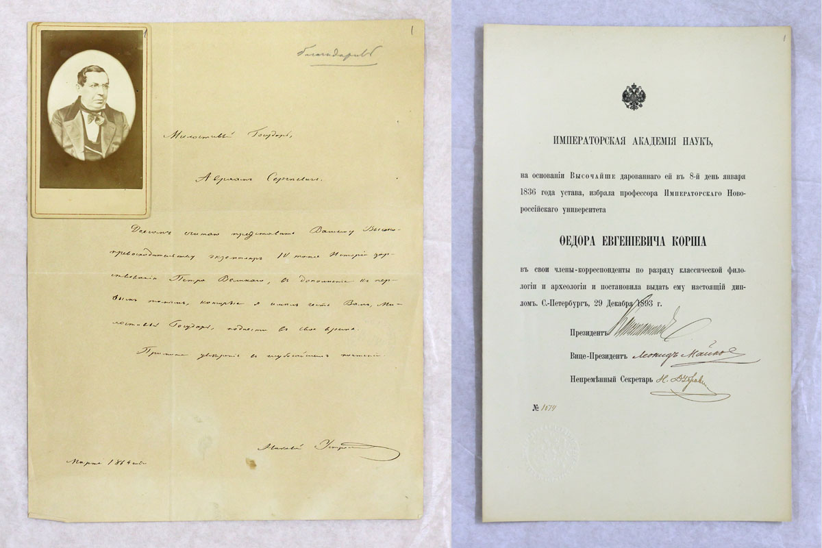 Справа: выданный Фёдору Евгеньевичу Коршу диплом на званиечлена-корреспондента Императорской академии наук по разряду классической филологии и археологии. 29 декабря 1893 года