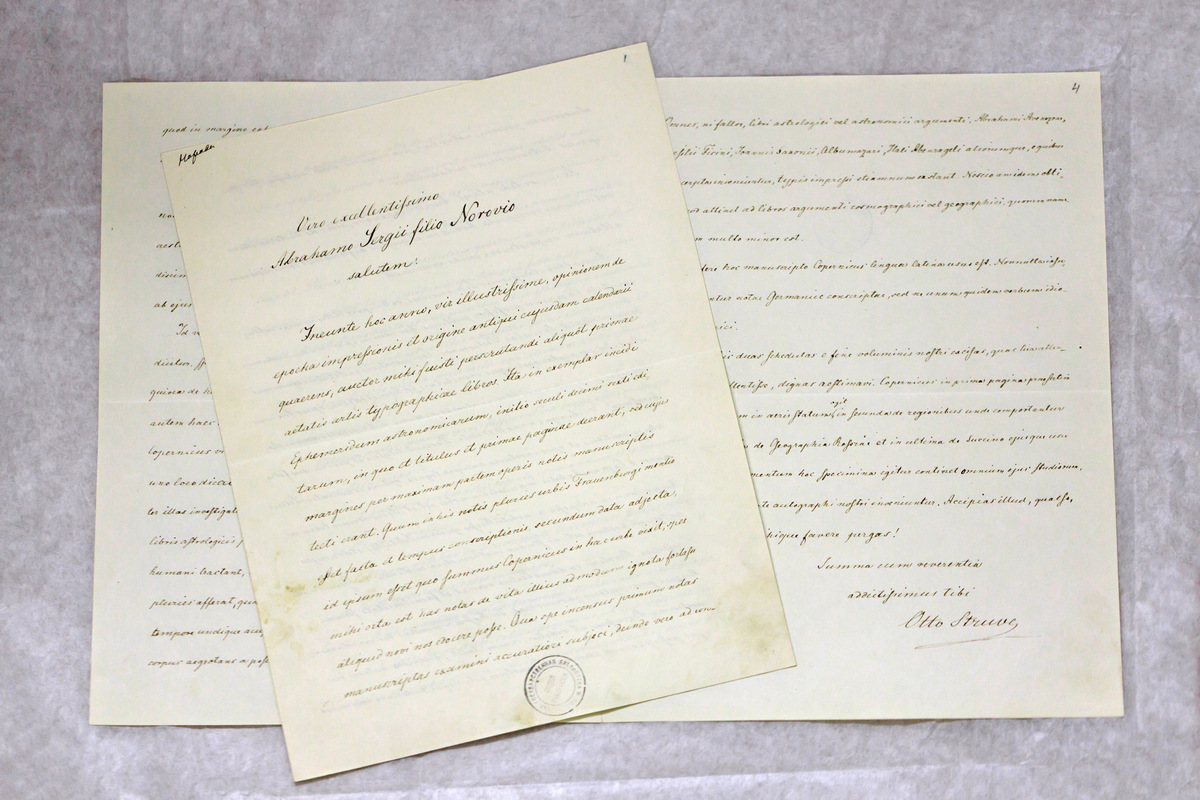 Фото: Мария Говтвань, РГБ Письмо Отто Васильевича Струве к Аврааму Сергеевичу Норову. 10 мая 1852 года. На латинском языке