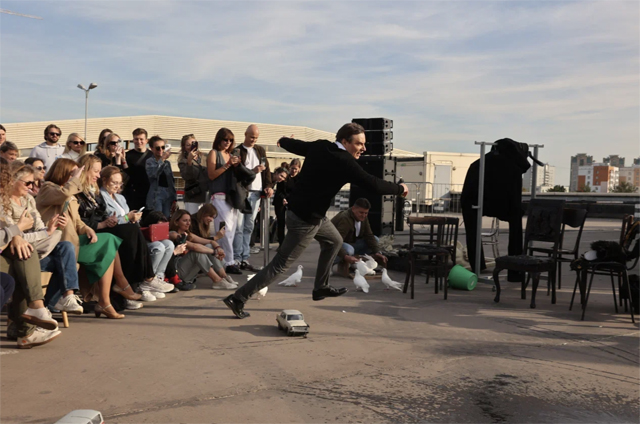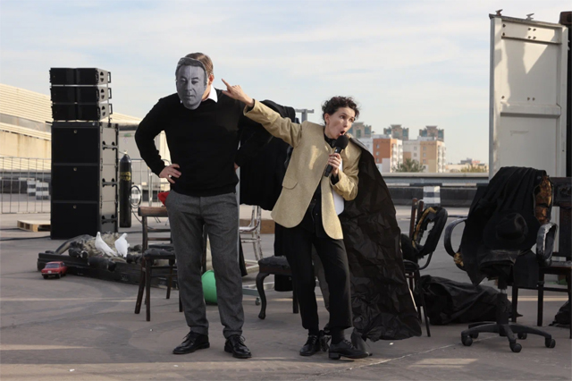 Строительный кран опускает на крышу торгового центра облезлый зеленый контейнер. Трудно представить менее приспособленные к театральному зрелищу условия: условия, которые театру необходимо преодолевать. Но это — не театр.