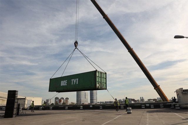 Через бетонный скелет необъятного торгового центра на краю Москвы, мимо пестрых витрин и назойливых запахов фуд-корта, вверх на эскалаторе — прямо на крышу, где уже выстроился полукруг зрителей и вот-вот приземлится зеленый металлический контейнер с выбеленными буквами «Все тут».