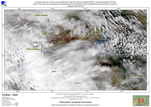 Значительное количество очагов отмечается в Красноярском крае. В Ужурском, Балахтинском и Кежемском районах Красноярского края пожары зарегистрированы преимущественно на землях сельскохозяйственного назначения. На спутниковых снимках видны горящие кромки пожаров и дымовые шлейфы от действующих пожаров.