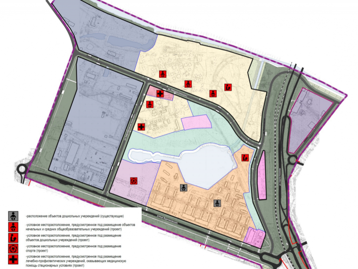 Школу и поликлинику предлагают построить за пределами КРТ — по другую сторону озера. Причем образовательное учреждение может занять часть территории, которую в 2019-м хотели отдать под парк.