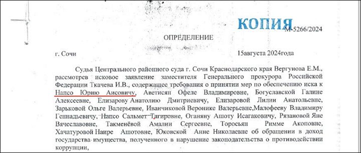 А в сентябре 2024-го заместитель генерального прокурора РФ Игорь Ткачёв обратился в Центральный районный суд Сочи в интересах Российской Федерации с иском к Напсо, а также к другим лицам, в том числе жене и матери знатного элдэпээровца (в соответчиках оказалось 15 фамилий). В качестве третьих лиц привлечены "Росимущество", администрация Сочи, ООО "Кубаньойл", "Национальная топливная компания", "Сочипетрол". Подробности приводило издание "Блокнот": "Генеральная прокуратура Российской Федерации выявила нарушения антикоррупционного законодательства в действиях депутата Государственной Думы РФ Юрия Напсо. Установлено, что с 8 декабря 2007 года Юрий Напсо является депутатом. Он занимал различные должности, включая заместителя и первого заместителя председателя Комитета по гражданскому, уголовному, арбитражному законодательству, а также первого заместителя председателя комитета по государственному строительству и законодательству. Все эти должности требовали от него полного и точного декларирования своего имущества, а также отказа от предпринимательской деятельности. Однако проверка выявила, что Юрий Напсо, занимая государственные должности, также являлся владельцем и руководителем коммерческих организаций. Он участвовал в их деятельности и получал от них доход. Игорь Ткачёв написал в своём иске: «Незаконным путем приобретал дорогостоящие объекты недвижимости, сведения о чём не декларировал и не сообщал в контрольные органы. То есть после прихода к власти он не отказался от предпринимательской деятельности, которой он занимался после избрания депутатом. Напротив, решил использовать высокое должностное положение для удовлетворения собственных корыстных интересов и достижения обогащения». В иске говорится, что депутат создал видимость того, что не имеет отношения к бизнес-проектам, но на самом деле он просто переоформил свои активы на аффилированных лиц, включая родственников. Согласно иску, Юрий Напсо и лица, находящиеся под его контролем, были причастны к захвату государственного имущества и легализации прав на самовольно возведённые постройки с использованием судебных процессов. В период с 2002 по 2005 год Напсо являлся владельцем 49% доли в уставном капитале компании «Спецсервисгаз» и акционером мясокомбината «Туапсинский». Когда он стал депутатом, то формально передал свою долю в «Спецсервисгаз» жене, но продолжал контролировать компанию через неё. В 2009 году Напсо, занимавший тогда должность, вместе с супругой и ещё одним лицом основал ООО «Национальная топливная компания». Уставный капитал компании был разделён на три доли, одна из которых принадлежала Напсо. Позднее он передал свою долю женщине, родившейся в 1986 году. В иске также говорится: «В целях получения контроля над рынком розничной продажи топлива, Юрий Напсо в 2014–2015 годах учредил ООО «Национальная топливная компания», ООО «Кубаньойл» и «Сочипетрол». Для сокрытия информации о конечном бенефициаре общества зарегистрированы на номинальных владельцев. Совокупная стоимость перечисленных хозяйствующих объектов составляет более 157 миллионов рублей, их ежегодная выручка превышает 2,8 миллиардов рублей». С 2019 года компания значительно увеличила выручку за счёт государственных и муниципальных контрактов на поставку топлива, которые составили более 30% от об