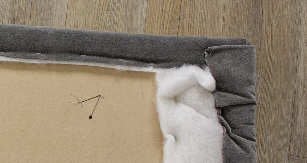 В углах аккуратно распределите синтепон, сформировав множество небольших складок и закрепив их степлером. Таким образом финальный результат будет более аккуратным, чем если бы вы просто загнули материал. Завершив работу, обрежьте излишки синтепона в углах.