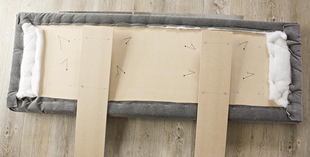 Возьмите плиту МДФ и сделайте на ней разметку для пуговиц. Просверлите отверстия по разметке. Отверстия должны быть достаточно большими для того, чтобы продеть в них иглу для обивки.