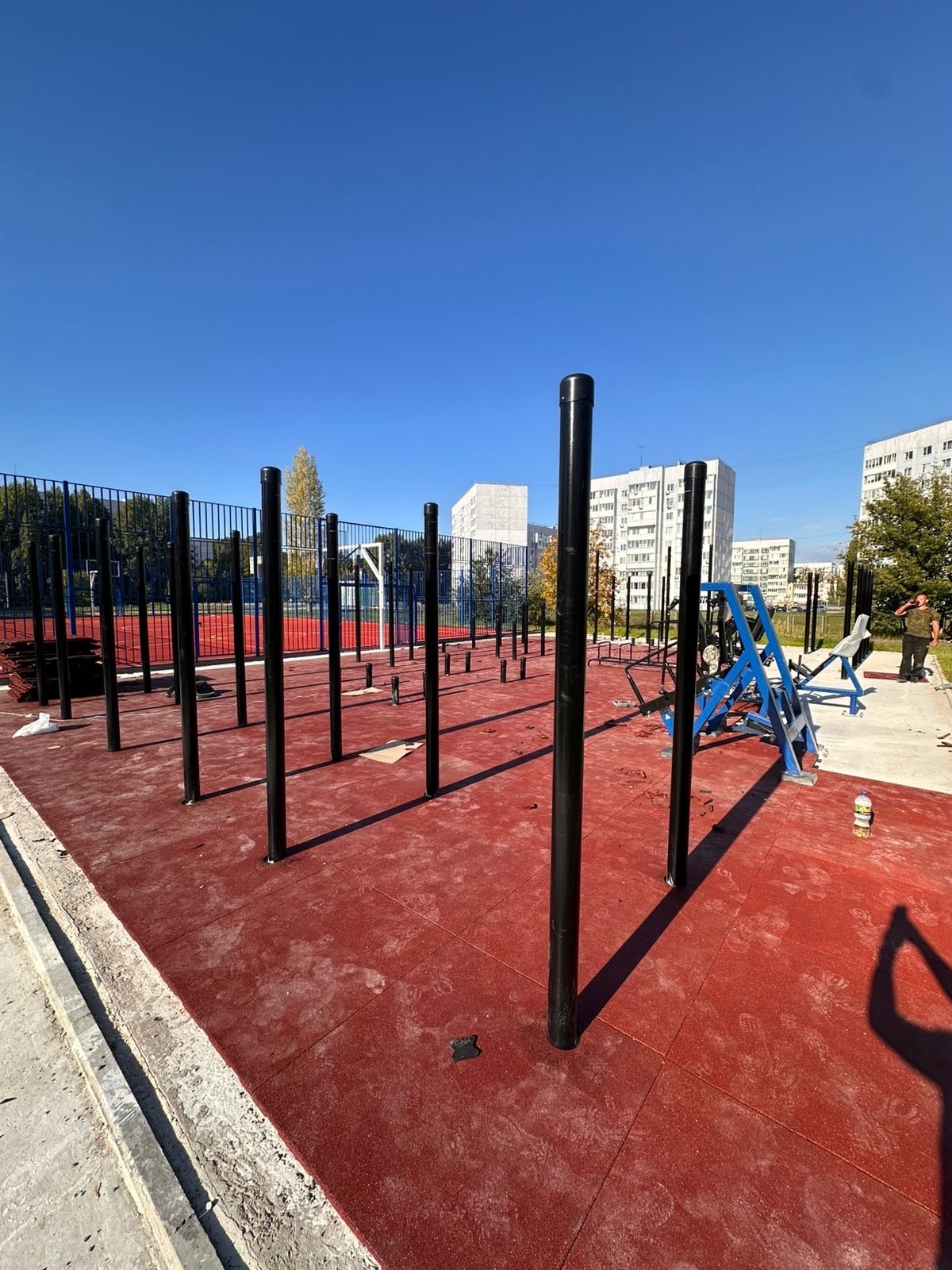 В частности, уже уложили безопасное резиновое покрытие, установили ворота для игры в мини-футбол, баскетбольные стойки с корзинами, оборудована Workout зона с уличными современными тренажерами, а также трибуна. В числе тренажеров: тройной каскад турников для отжиманий и подтягиваний, рукоход, шведскую стенку с тремя турниками, скамьи для упражнений на брюшной пресс, гимнастические кольца и канат, турники классического хвата, лавки с упорами, двойные брусья для отжиманий.