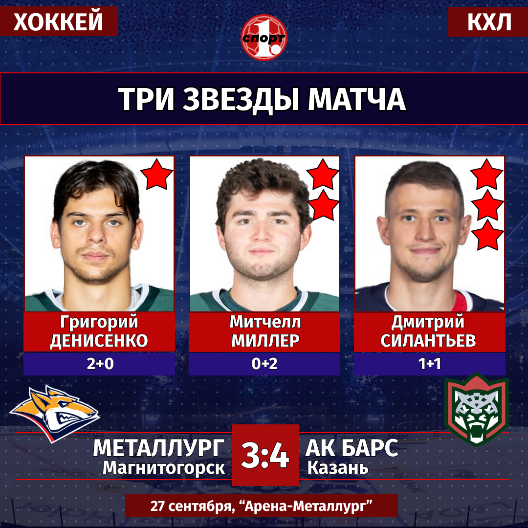 Хоккей. Чемпионат КХЛ. Сезон-2025/2026. 27 сентября. «Металлург» (Магнитогорск) — «Ак Барс» (Казань) — 3:4 (1:0, 2:1, 0:3).