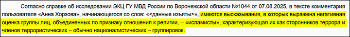 Происходящее нельзя недооценивать. Абсурдных дел, похожих на омское, расплодилось немало. 19 августа Новоусманский районный суд Воронежской области (судья Людмила Шлыкова) вынес постановление о назначении административного наказания ещё одной пенсионерке за разжигание межнациональной розни. ЦПЭ УМВД защитил мир и порядок и пресёк опасные действия "гражданки РФ, имеющей высшее образование, замужней, имеющей на иждивении одного несовершеннолетнего ребёнка". Зайти на Алексеевский рынок, пройтись ночью по криминогенным заведениям на проспекте Революции — это всё на перспективу. Сначала следует разобраться с пенсионеркой. Что же она такого написала?