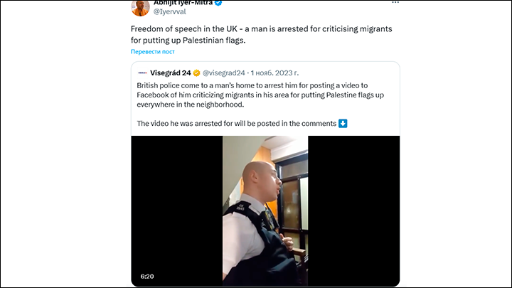 "Свобода слова в Соединённом Королевстве: мужчина арестован за критику мигрантов, которые вывесили палестинские флаги". Скриншот страницы сайта x.com