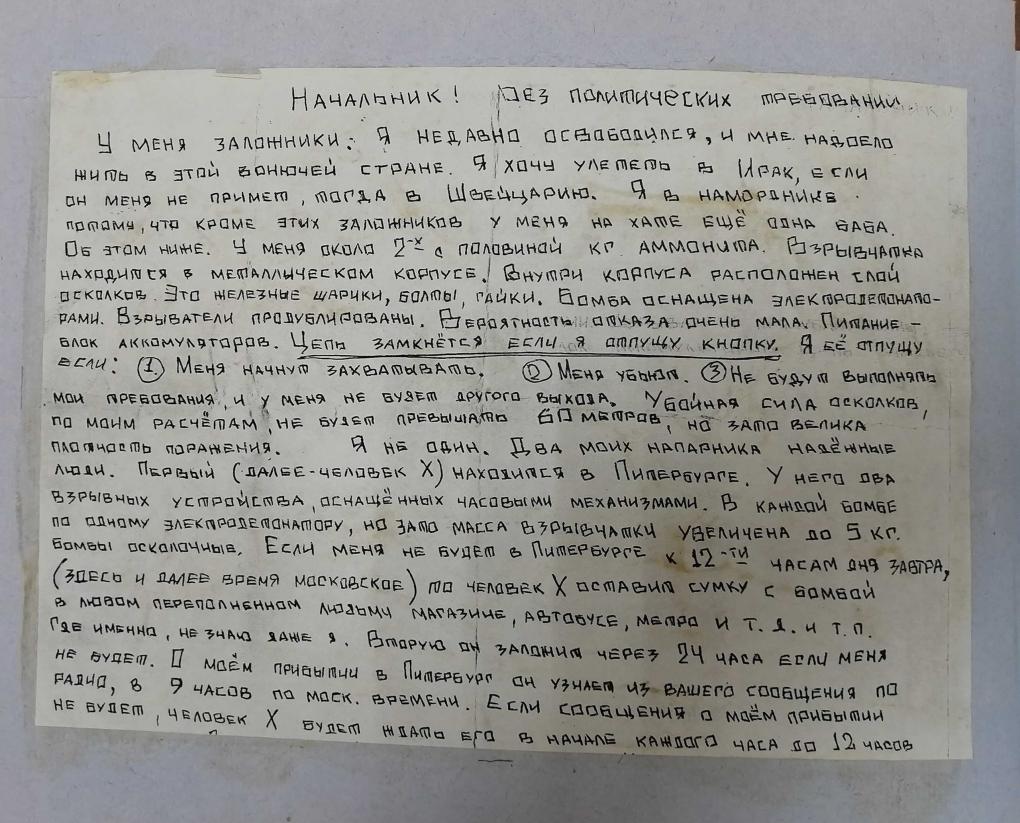 Кроме того, мужчина потребовал автобус до аэропорта и самолёт, на котором планировал улететь сначала в Санкт-Петербург, где его якобы ждал сообщник, а затем в Ирак. Никаких политических требований преступник не выдвигал, а о своих мотивах высказался предельно просто: «мне надоело жить в этой вонючей стране».