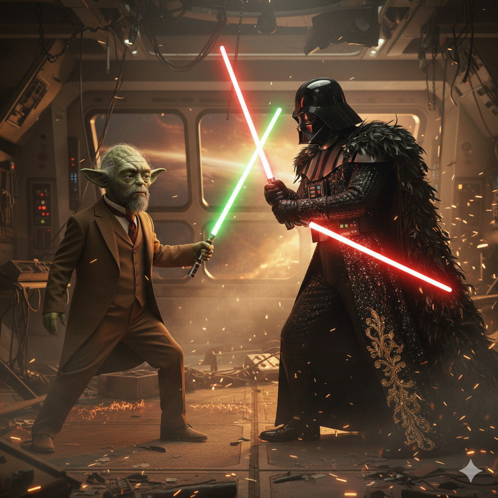 И это мы еще смотрим только те клипы, которые разрешено смотреть... Попросили у киберразума описать ситуацию на эстраде 2019-го — он нарисовал пернатого Киркорова в шлеме Дарта Вейдера, сражающегося с гибридом Достоевского и Йоды. Разгромили всю рубку, намусорили...
