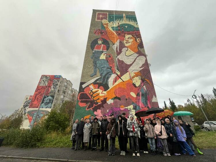 В заполярном городе горняков появился новый мурал под названием «Северный триптих». Его в рамках фестиваля паблик-арта «Смена» на стенах соседствующих девятиэтажных домов нарисовали знаменитые художники-монументалисты Василий Кармазин, Мансур Зияев и Андрей Бергер.