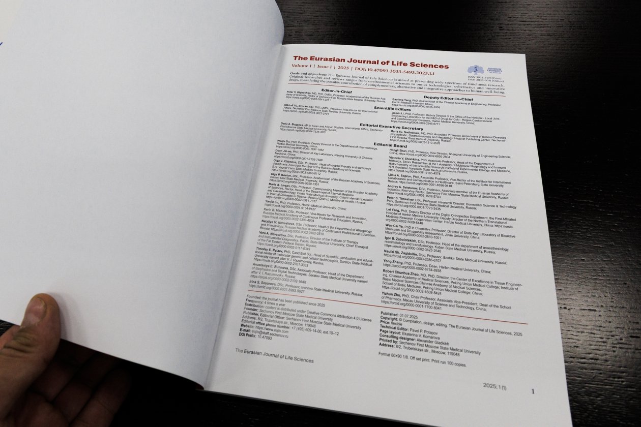 Торжественное открытие заседания Постоянного Совета РКАМУ продолжила презентация нового научного журнала, первого печатного издания РКАМУ — "Евразийского журнала наук о жизни" (16+). Как отметил сопредседатель Ассоциации Петр Витальевич Глыбочко, журнал, честь издания которого предоставлена Сеченовскому Университету, станет международной научной платформой, которая объединит исследователей, клиницистов и специалистов в области биомедицины для продвижения инновационных решений в здравоохранении и смежных дисциплинах. В первом номере научного журнала, который вышел в июле 2025 года, опубликованы работы исследователей из Сеченовского Университета, вузов Саратова, Владивостока, Воронежа, Омска и Харбина. Публикации посвящены лазерным технологиям в медицине, разработке новых препаратов и инновационным методам лечения сердечно-сосудистых патологий.