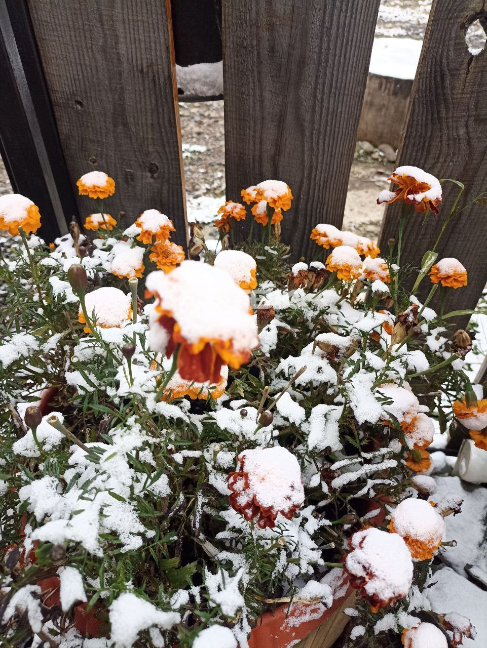 А такую красоту нам прислали из деревни Мостовское Большемуртинского района. Снег плотно усыпал и цветы, и машины.
