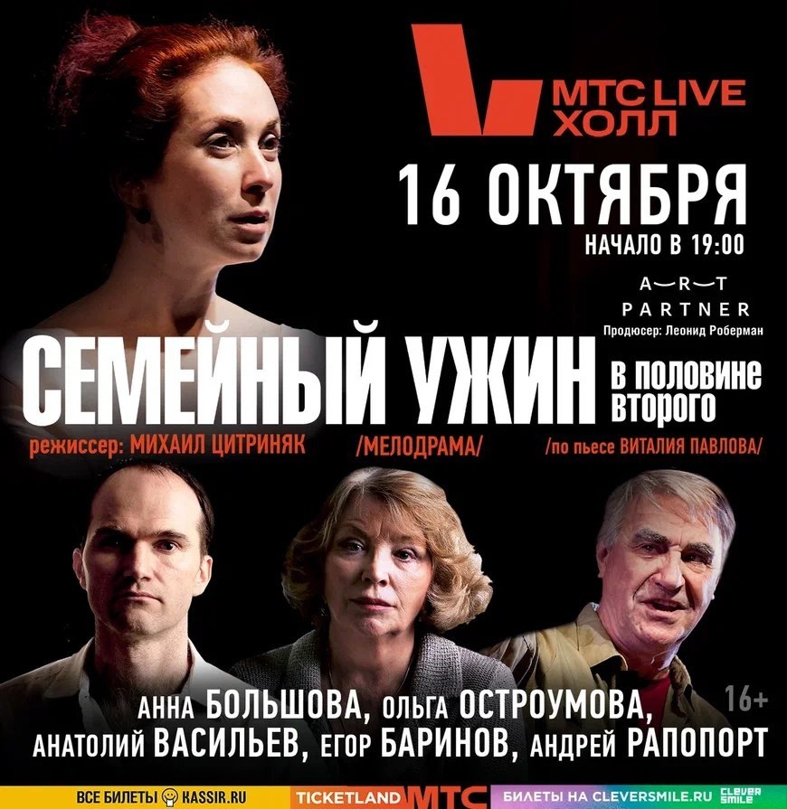 Первая постановка мелодрамы по пьесе драматурга Виталия Павлова в России. Зрители увидят историю мужчины и женщины, которые полюбили друг друга в юности, но не смогли остаться вместе из-за интриг родных и собственной нерешительности. Спустя 20 лет они снова встретились. Главные роли в спектакле играют Анна Большова, Ольга Остроумова, Анатолий Васильев, Егор Баринов и Андрей Рапопорт.