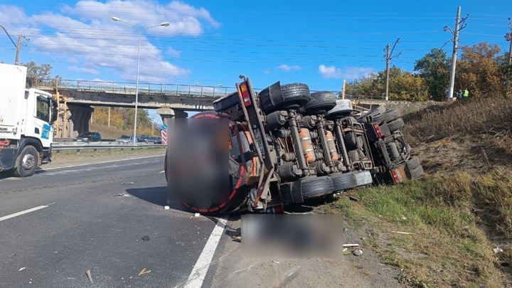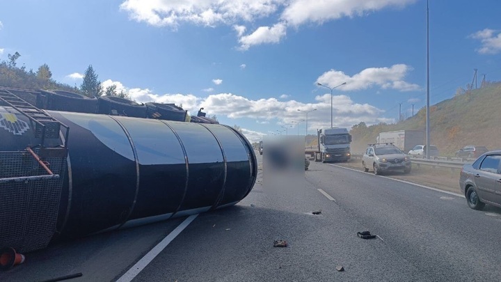 Пытаясь уйти от столкновения с людьми, водитель не справился с управлением, в результате чего фура перевернулась.