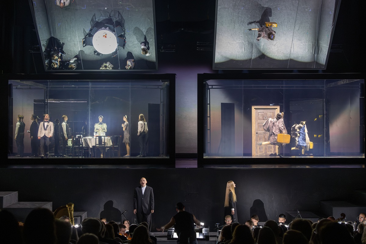 Главные персонажи оперы пытаются подняться к свету из воображаемого ада, а зрители путешествуют между прошлым и настоящим, иными мирами и другими жизнями. На сцене всё это происходит одновременно — по принципу симультанного действия площадного театра.