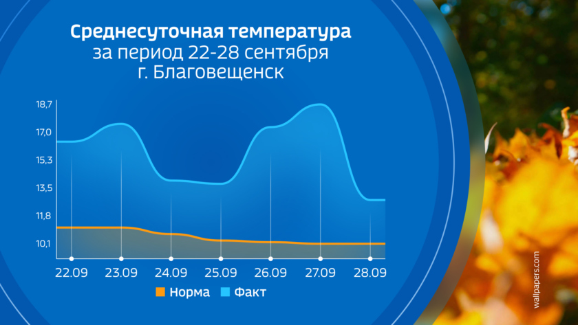 На календаре конец сентября, а лето на улице задерживается. В последние дни среднесуточная температура регулярно превышает летние 15 градусов. Благодаря теплой погоде в этом сентябре золотая осень выглядит особенно красивой. Начало новой рабочей недели сохранит тепловой тренд, затем Амурская область вступит в переходный осенний период с резкими перепадами температуры и осадками.