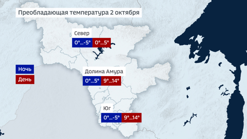 Ночью в четверг температура по области падет до 0 — минус 5 градусов, включая южные районы. В долине Амура ночью будет положительная температура. Днем воздух прогреется до 5 градусов на севере и до 9-14 в центральных и южных районах.