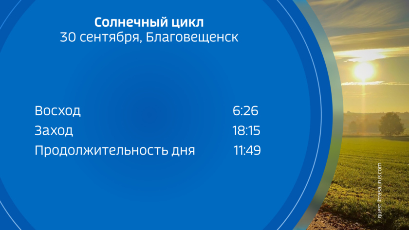 Восход солнца 30 сентября в Благовещенске ожидается в 06:26, заход — в 18:15, продолжительность светового дня — 11 часов 49 минут.