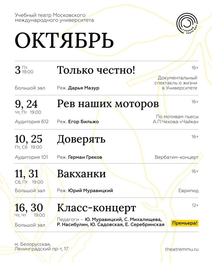 9, 24 октября — «Рев наших моторов» Егора Бильжо — переплетение личного и чеховского, обязательно для всех, кто хочет узнать, что такое метамодерн и новый театр!
