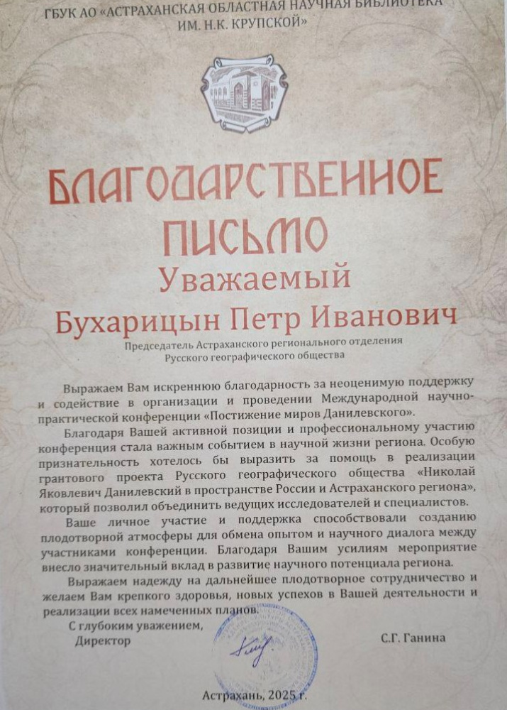В подготовке и реализации этого межрегионального грантового проекта принял активное участие председатель Астраханского областного отделения Русского географического общества Петр Бухарицин. Проведение конференции накануне XVII Съезда РГО, который состоится в Москве 21-24 октября 2025 года, становится важным вкладом научного сообщества региона в празднование юбилея Общества.