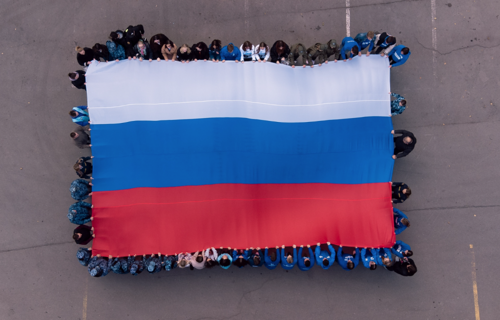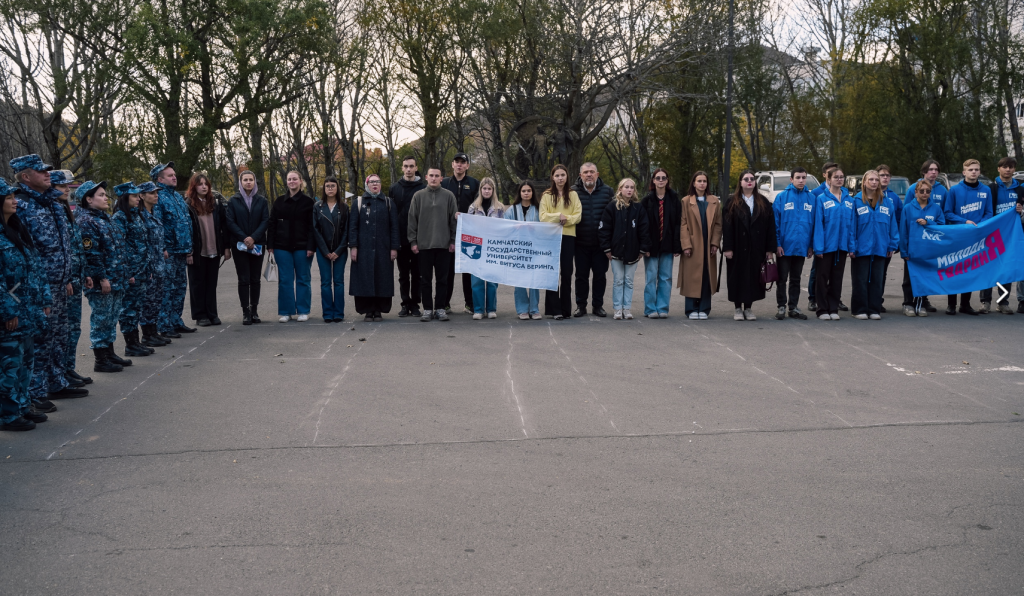 Сотрудники УИС Камчатского края, Центр Камчатского Дворца молодёжи, Волонтёры Победы, Молодая Гвардия, студенты и сотрудники КамГУ им. Витуса Беринга, Центр Воин выстроились в живую надпись «РОССИЯ» и развернули Государственный флаг Российской Федерации.