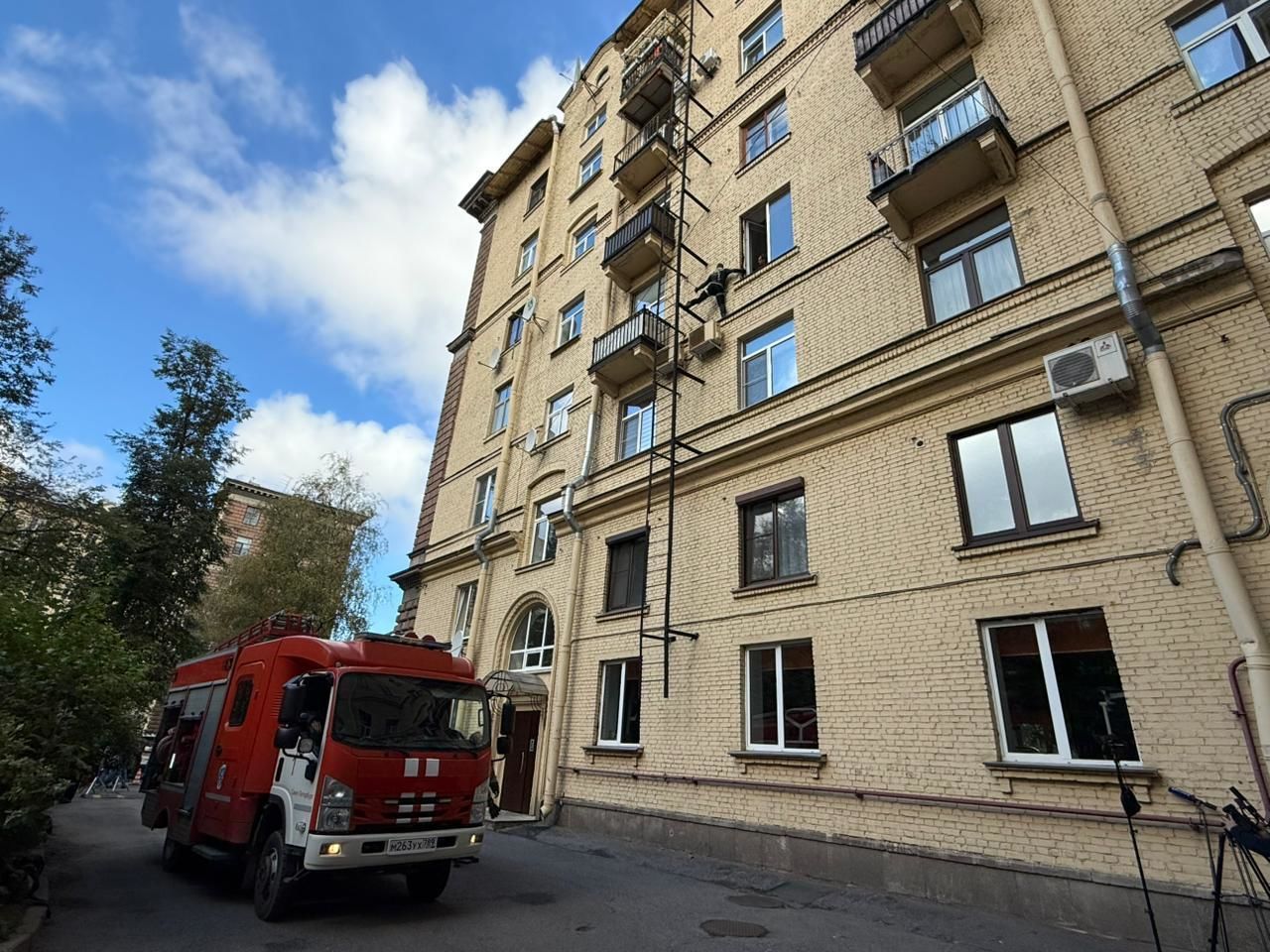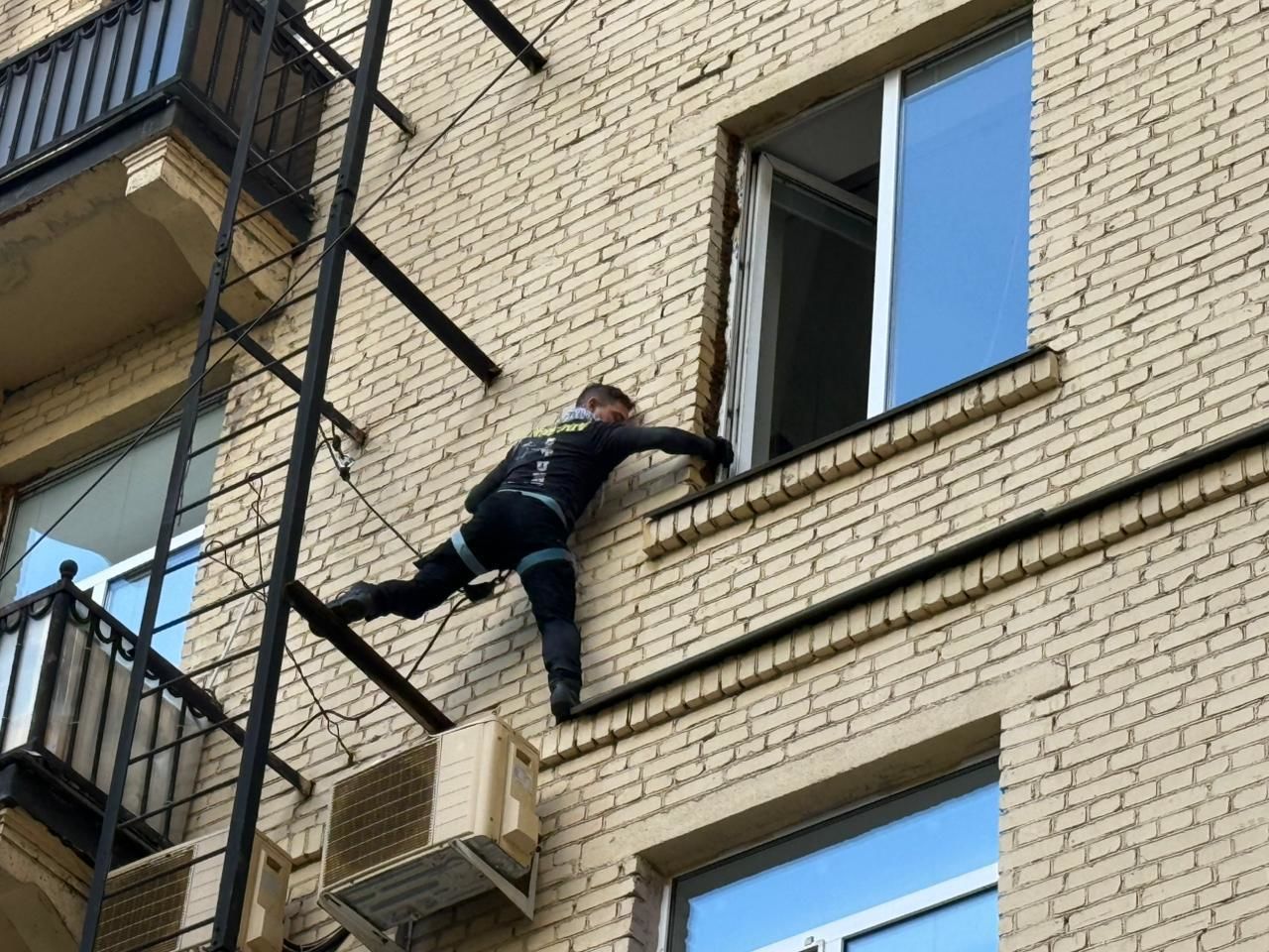 Во дворе одного из домов выставили пожарный расчет, на уровне четвертого этажа закрепили страховочные тросы, расчистили балкон от бытового мусора, проверили на прочность пожарную лестницу, убрали металлические подоконники – они не закреплены и скользкие, поэтому могут в любой момент слететь вниз… В окне через стекло виден силуэт маленького ребенка в полосатой пижаме.