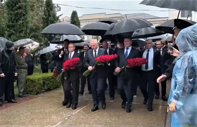 Затем Кириенко, Гунба, другие официальные лица и другие участники мероприятий возложили цветы к мемориалу Ардзинбе в селе Нижняя Эшера.