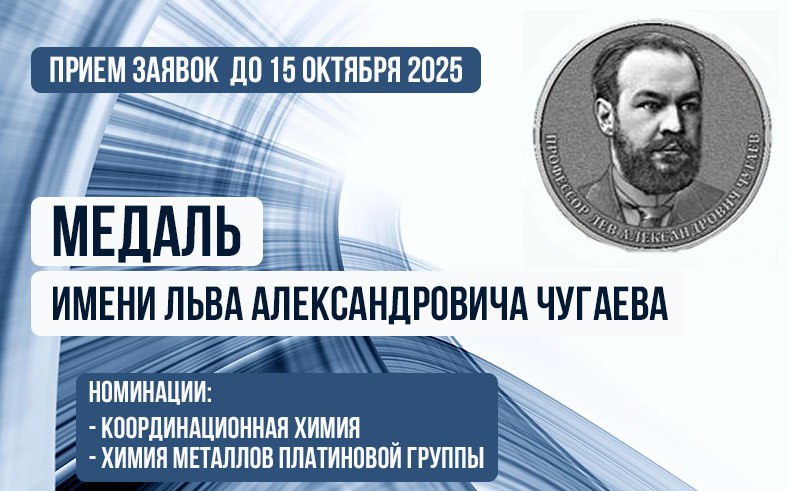 Открыт прием заявок на соискание медали им. Л.А. Чугаева, совместно присуждаемой Российским химическим обществом им. Д.И. Менделеева и Институтом общей и неорганической химии им. Н.С. Курнакова РАН.
