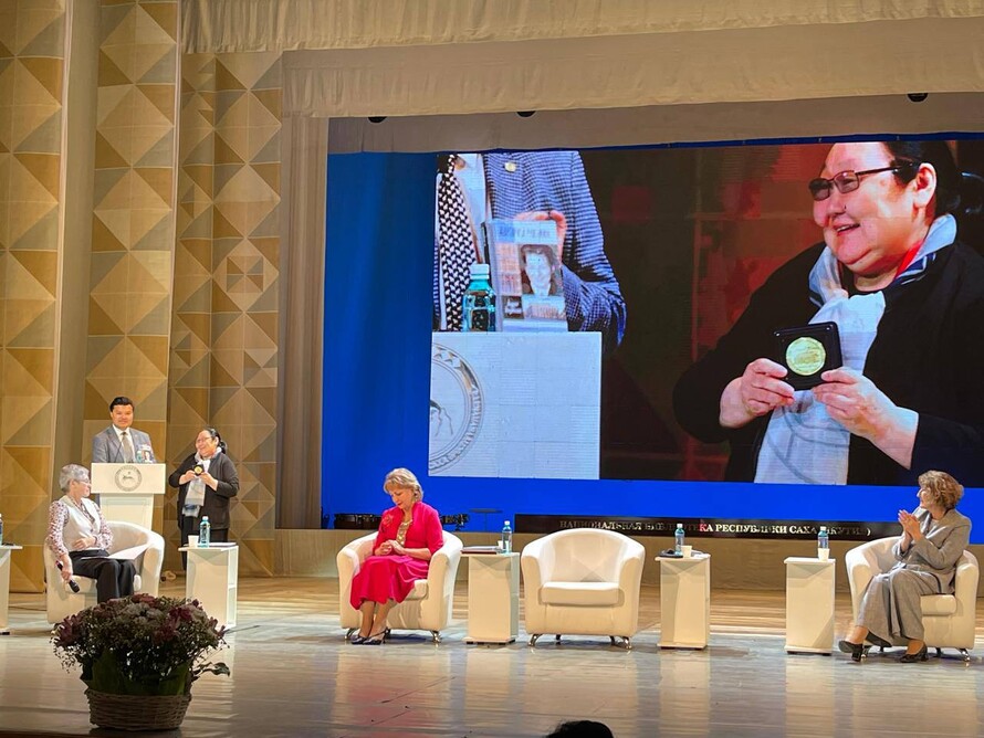 От лица Библиотеки иностранной литературы Мигель Хайрович вручил Саргылане Максимовой памятные презенты по случаю 100-летия возглавляемой ею Национальной библиотеки РС (Я) — медаль, отчеканенную к вековому юбилею «Иностранки», и недавно вышедшую в серии ЖЗЛ книгу Андрея Низовского «Маргарита Рудомино».