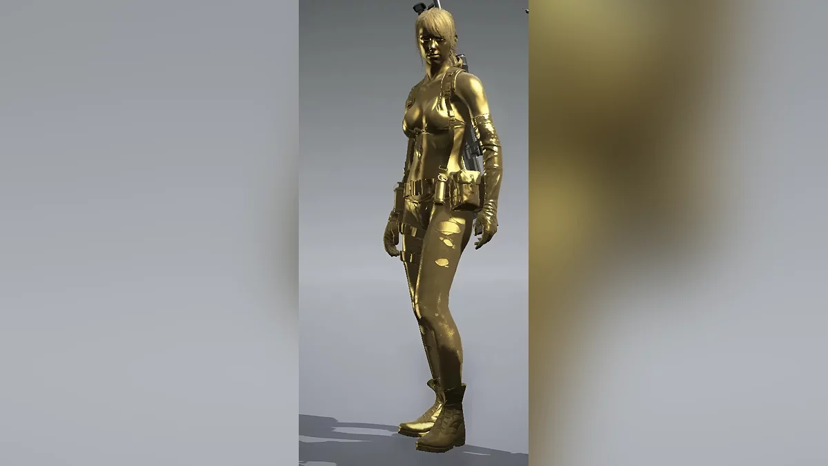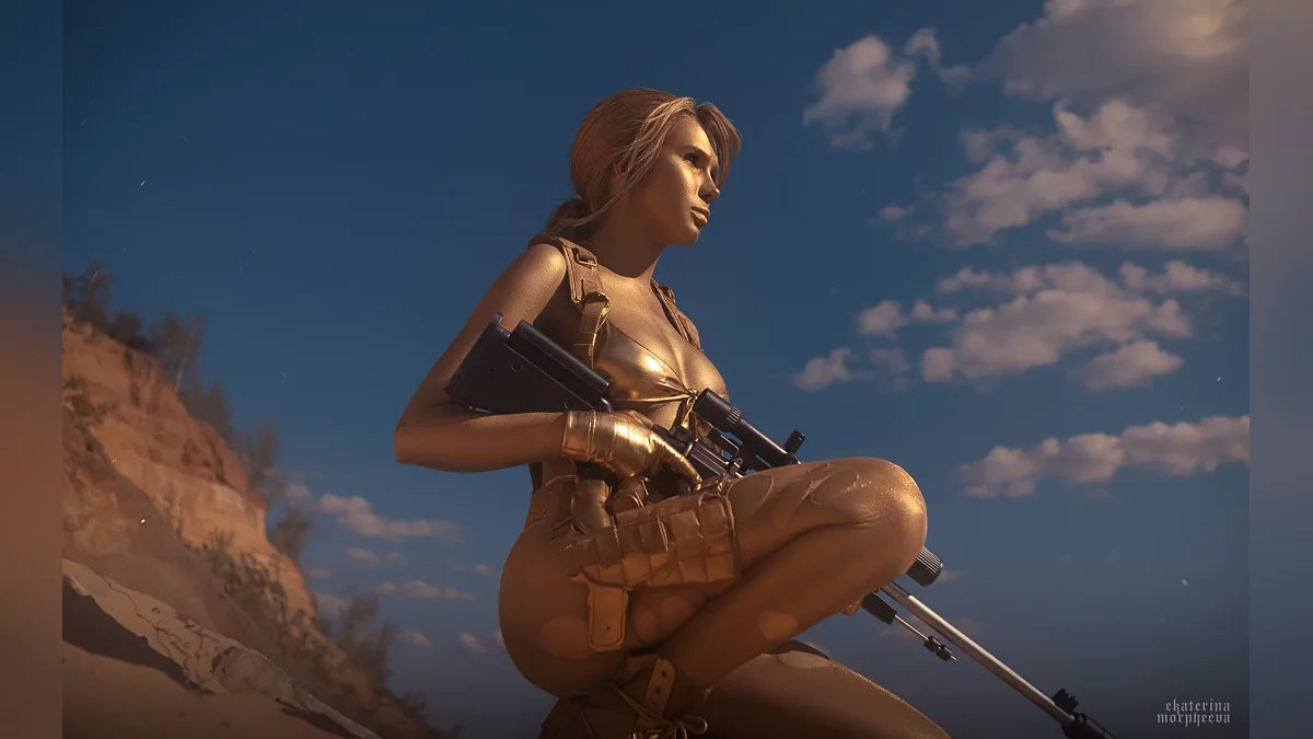 Среди скинов Молчуньи есть уникальный золотой облик. Он выглядит так, словно снайпершу облили краской. Его можно получить, если развить отношения с девушкой до ста процентов. Именно к этому образу обратилась Frau_Haku. Фотограф — Ekaterina Morpheeva. А если вас заинтересовала пятая MGS — обратите внимание на нашу статью.