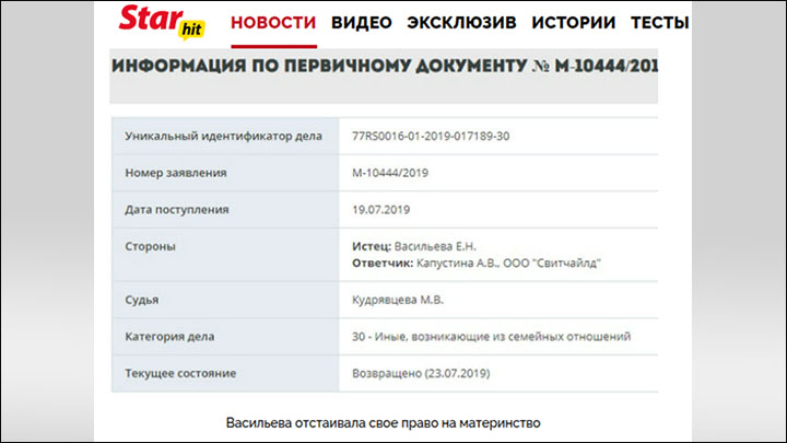 Васильева через суд добилась признания своего материнства в отношении ребёнка, рождённого суррогатной матерью. Скриншот: Star Hit