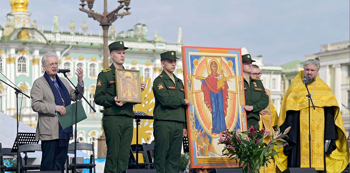 В Санкт-Петербурге на церемонию передачи иконы "Августовская Победа" Мариуполю в рамках Международного фестиваля искусств "Мастер-класс" были приглашены герои специальной военной операции. В торжественной церемонии приняли участие генеральный директор Государственного Эрмитажа Михаил Пиотровский, епископ Кронштадтский, наместник Свято-Троицкой Александро-Невской лавры владыка Вениамин, настоятель церкви Спаса Нерукотворного Образа отец Марк (Святогоров), кавалер ордена Мужества, председатель региональной общественной организации "Ассоциация ветеранов специальной военной операции "Защитники Родины" Георгий Журавлев, ветеран СВО Иван Есипов, заместитель министра внутренних дел Игорь Зубов, глава муниципального образования "Дворцовый округ" Анатолий Харченко, заместитель председателя Комитета по культуре Санкт-Петербурга Антон Александров, автор и художественный руководитель фестиваля "Мастер-класс" Тамара Семенова, представитель компании благотворителей "Хранители" Александр Чистов.